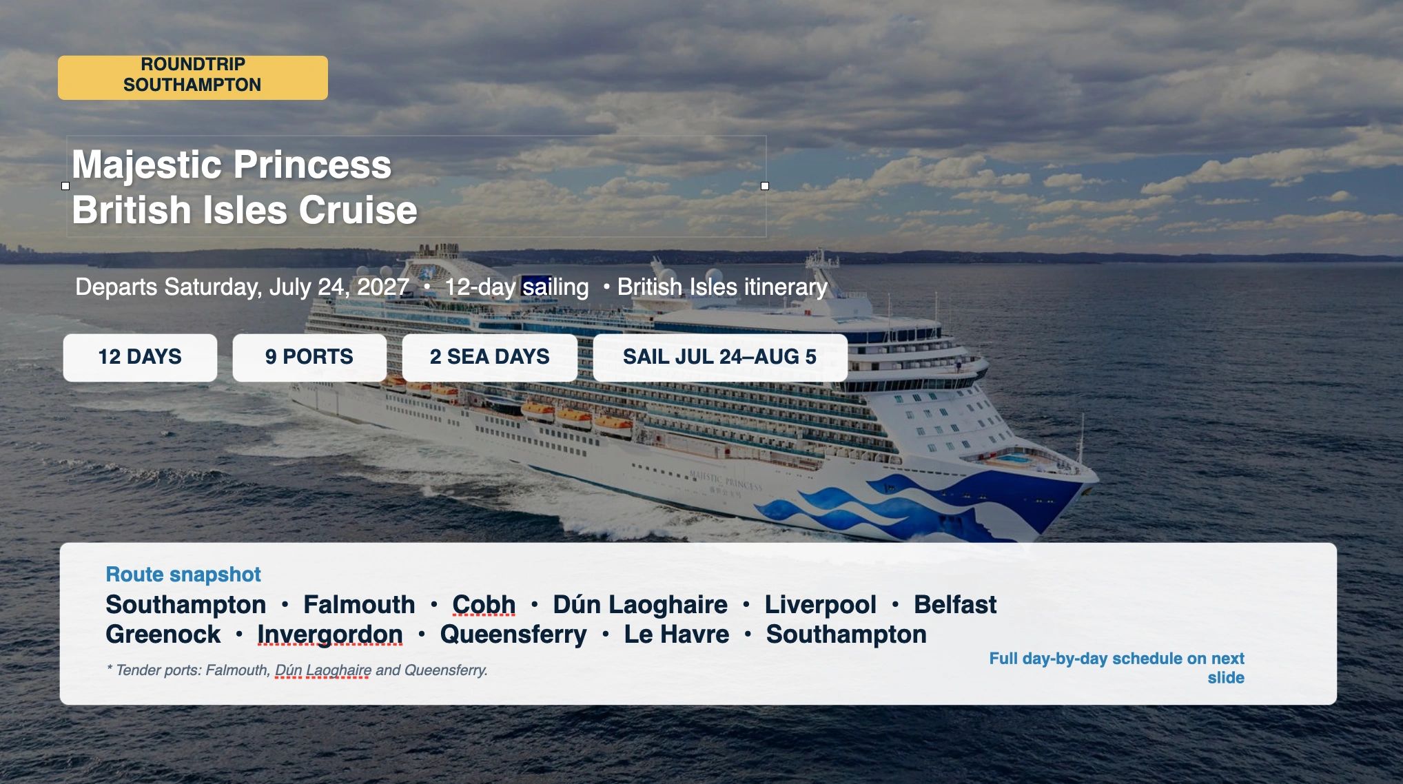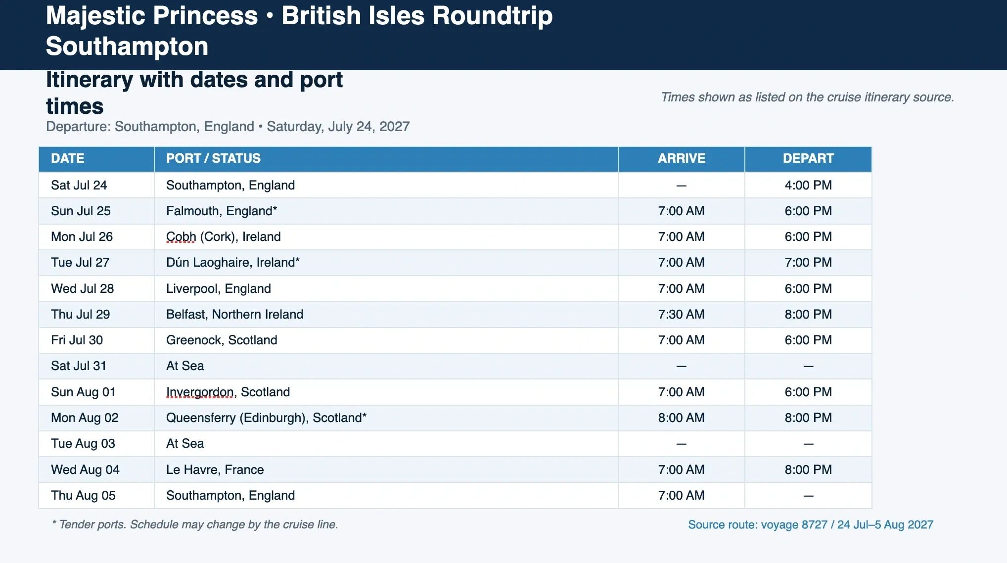 Embark on a 12-day roundtrip voyage from Southampton aboard the luxurious Majestic Princess, exploring the coastal treasures of England, Scotland and Ireland. Discover charming harbors, historic cities and scenic landscapes -- with memorable visits to France and the picturesque shores of Cornwall along the way. this journey blends iconic landmarks with hidden gems, offering an unforgettable taste of the British Isles and beyond!